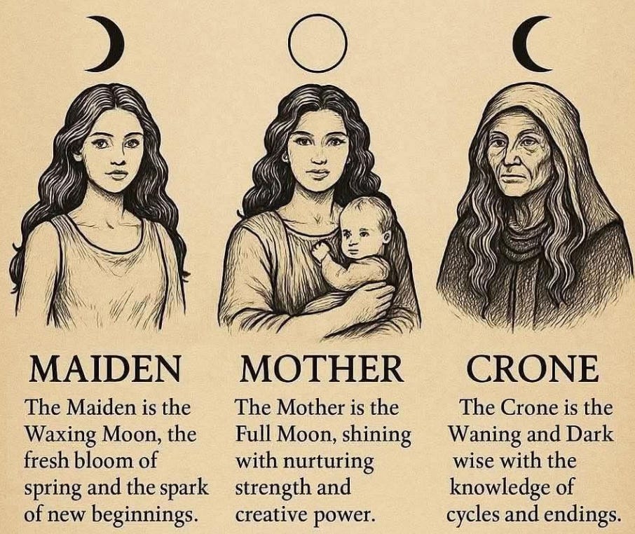 And then there’s the other side of my algorithm: the “divine feminine” corner of the internet, where everything is moonlit and lavender-scented and somehow still ends up circling back to the womb. In this discourse, femininity isn’t just a social category; it’s a cosmic assignment. Your cycles are sacred. Your body is a portal. Menopause is framed as ascension, the final step from maid to mother to crone. A promotion into the wise woman era where you finally step into your power.