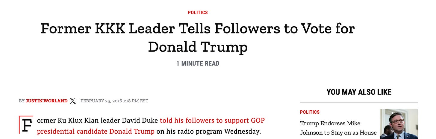 More importantly, extremists attach themselves to whoever they think will amplify their worldview. Duke publicly urged support for Donald Trump in 2016. That is also documented, including in mainstream coverage at the time.