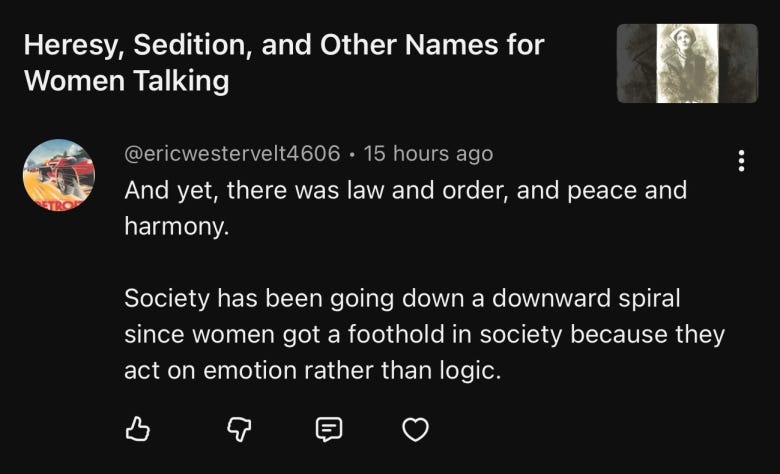 So no, I’m not taking “peace and harmony” lectures from someone who hears “women were hanged for speaking” and responds with nostalgia for the era’s supposed calm. That’s not calm. That’s coercion.